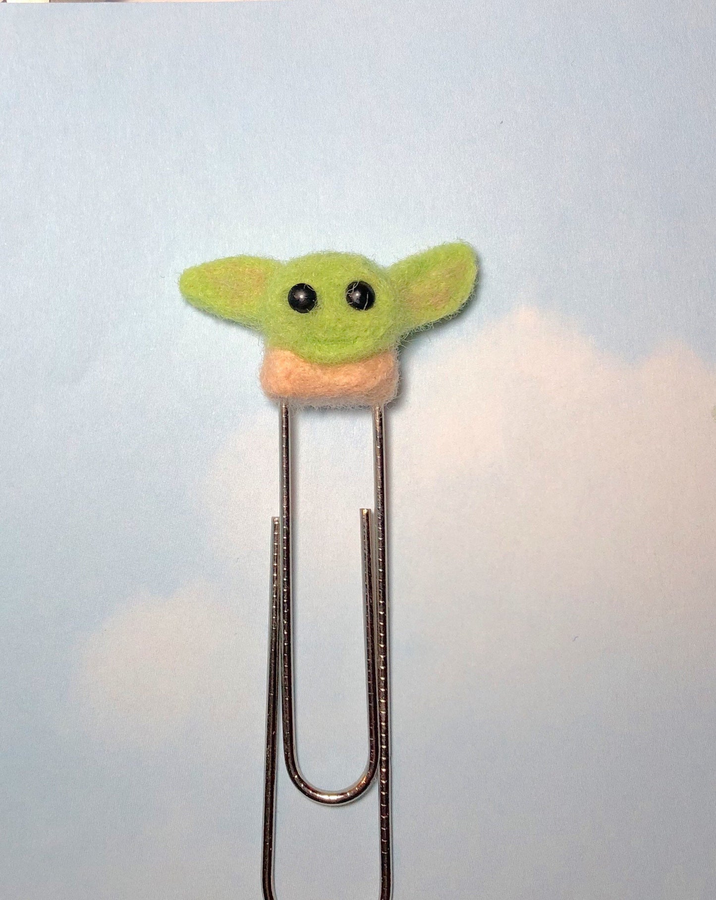 Adorable Baby Alien inspired paper clip is needle felted by me out of 100% wool. The woolly figure is securely fastened to a jumbo sized paperclip: silver or gold. Figure measures about 2 inches wide and is about 1 inch tall.