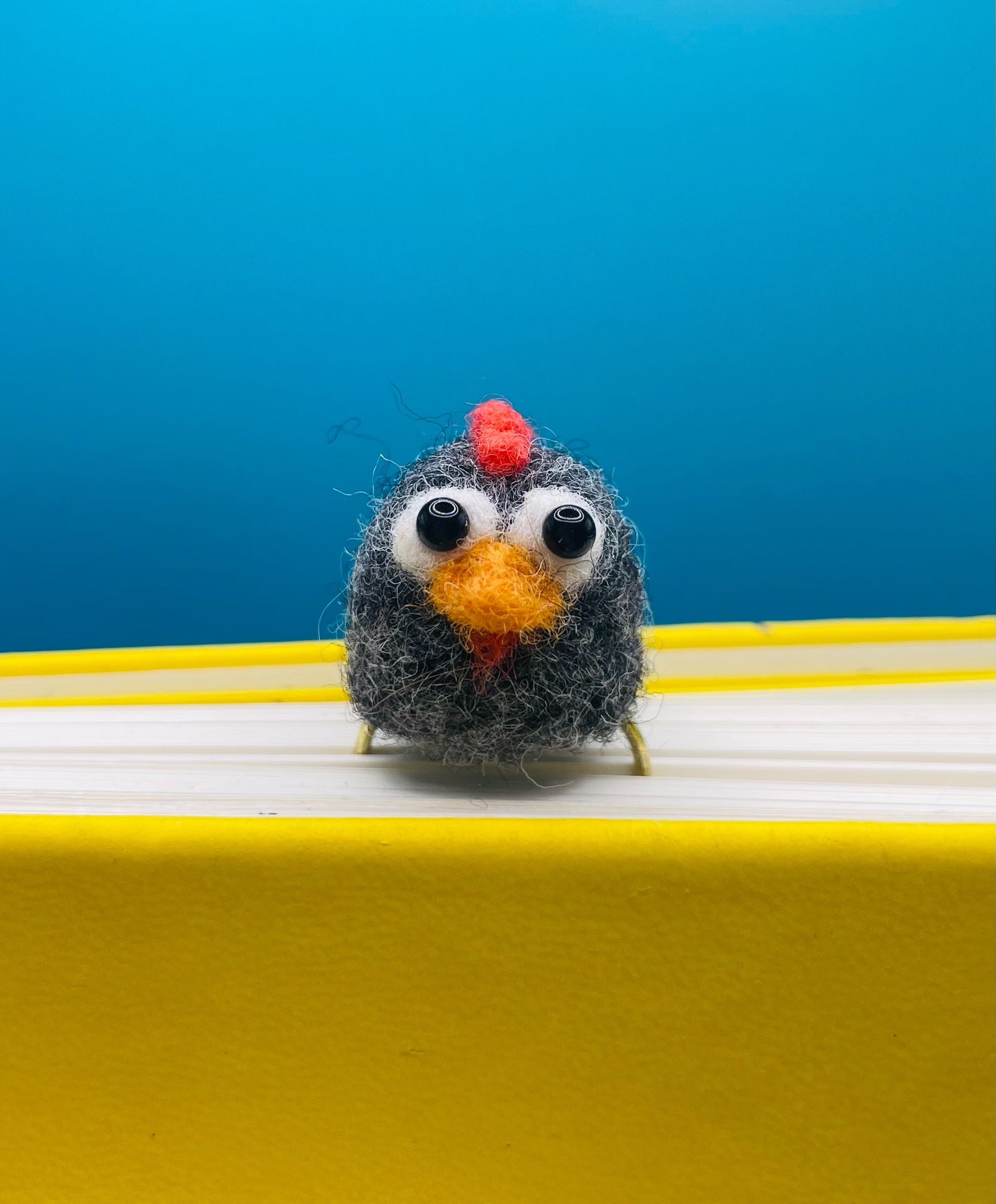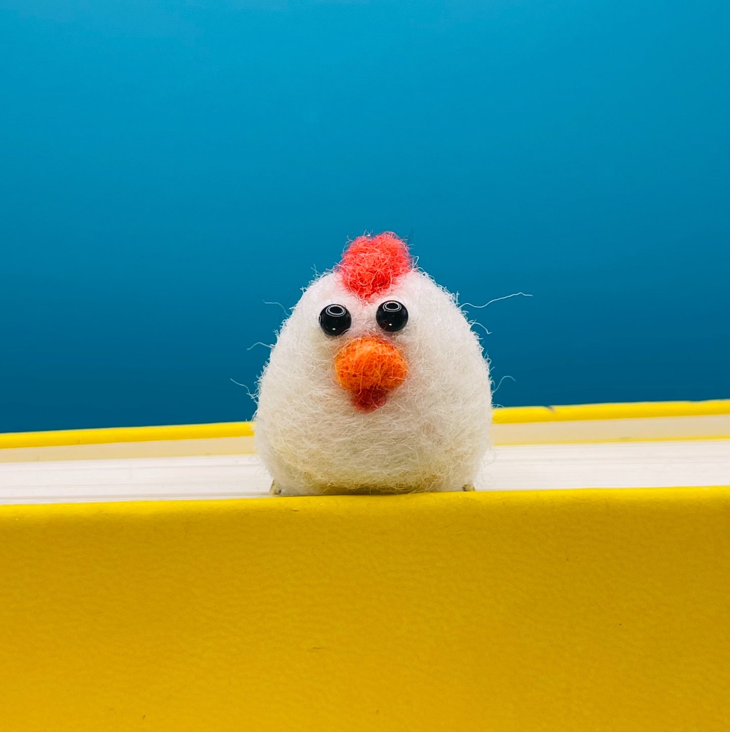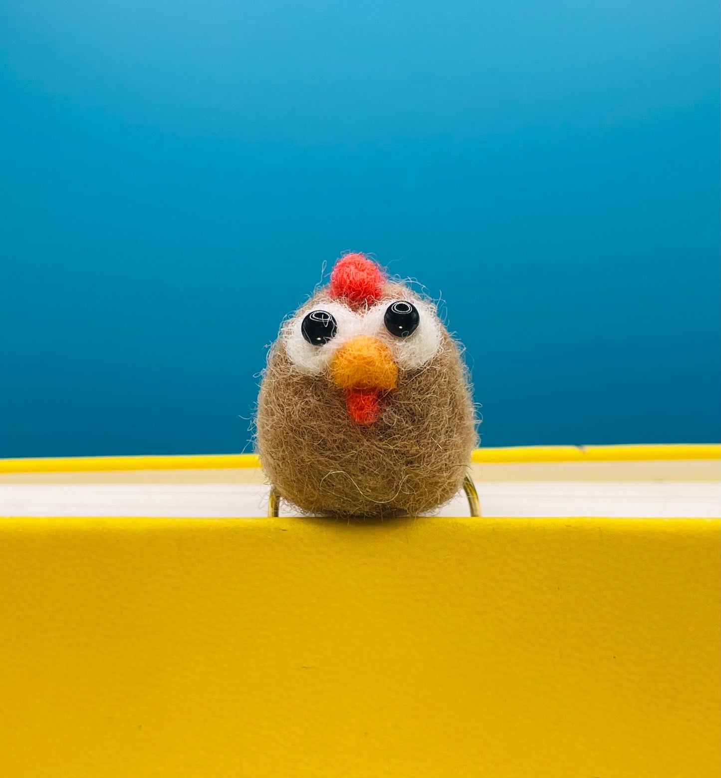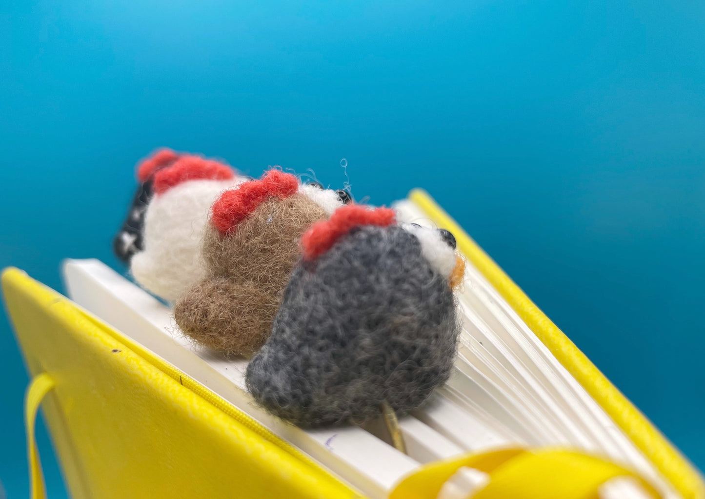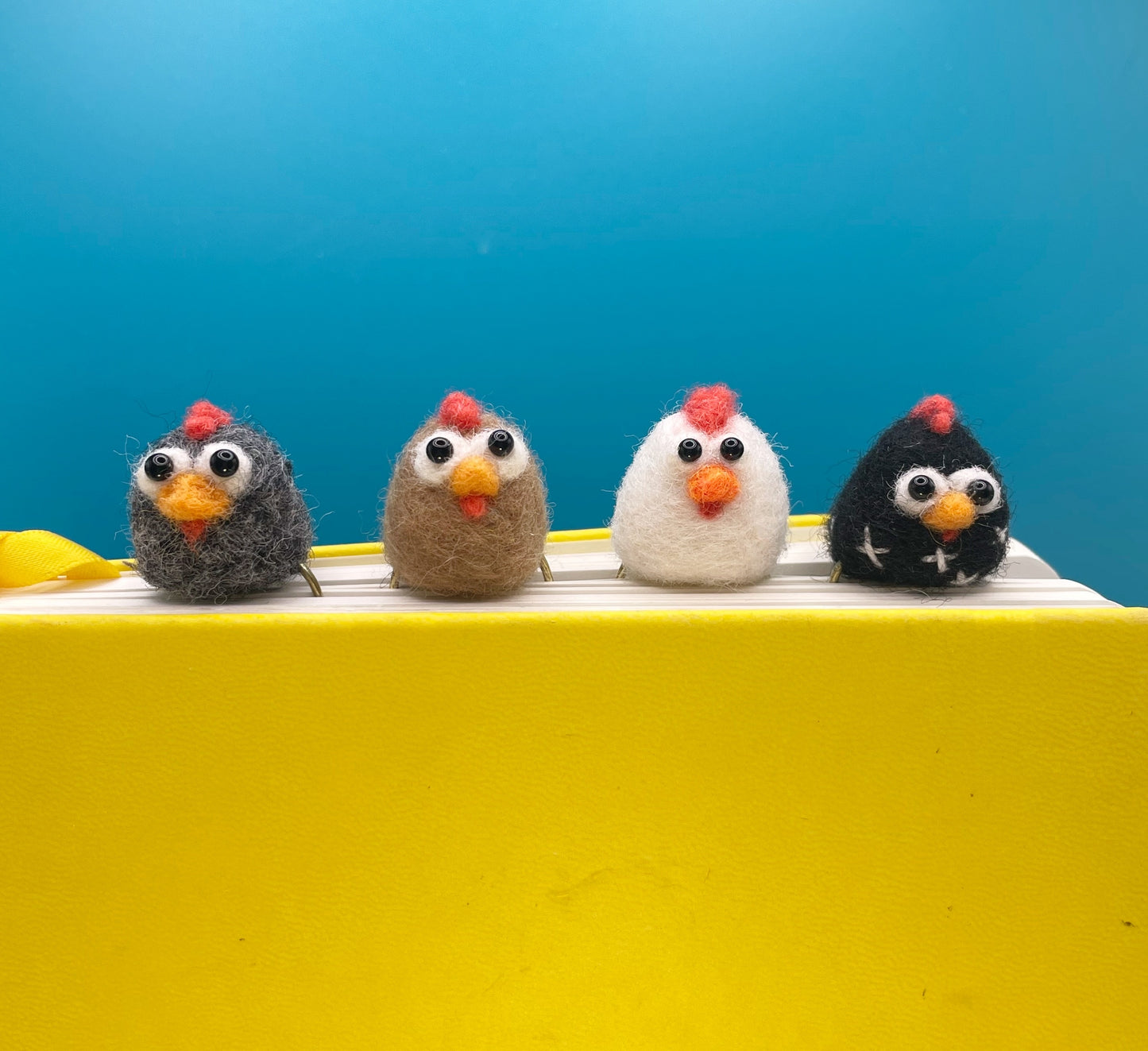 Each woolly hen measures about 0.75 inches wide and 1 inch tall. Hens are secured to a wide jumbo sized (1.97 inches tall) paper clip in the finish of your choice: silver, gold or rose gold.