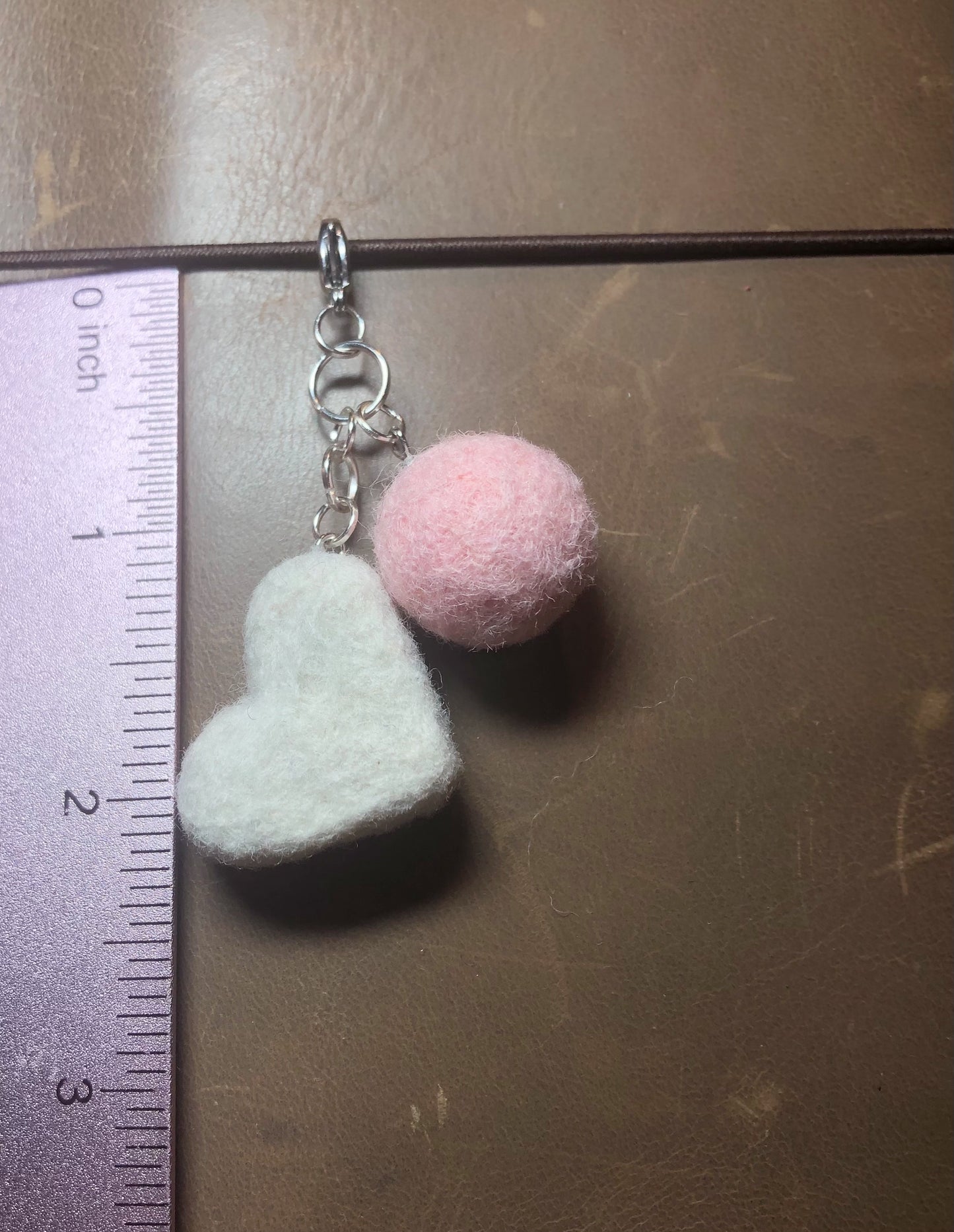 This charm is includes a one inch wool heart & a wool pom attached to a silver lobster clasp. The wool pieces are made by me out of Maori wool using the process of needle felting. From the tip of the lobster clasp to the bottom of the charm measures about 2.25 inches.