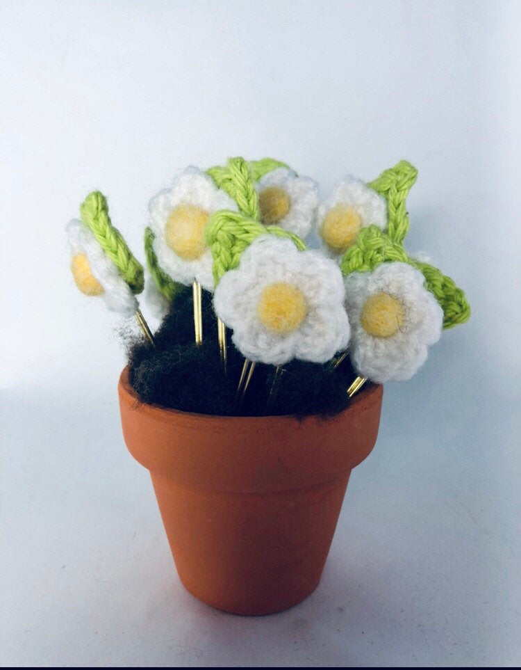 Crocheted white daisy with yellow felted wool center is securely fastened to a jumbo paperclip in the finish of your choice: silver or gold-tone. May be used in your planner, journal or book as a page marker. Flower measures about 3cm in diameter and has a cute small leaf on the back of the clip.