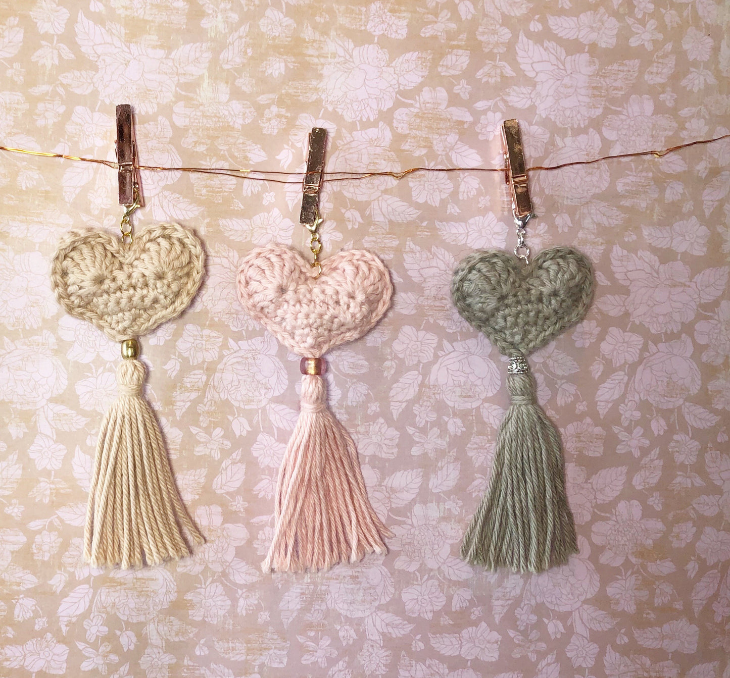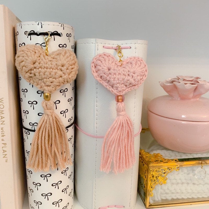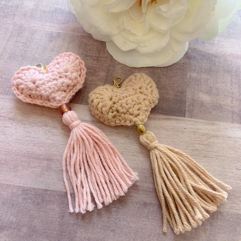 Each charm is made up of a crocheted puffy heart, a coordinating bead and tassel. From the top of the lobster clasp to the bottom of the tassel is about 5 inches. The heart measures 2 inches by 2 inches. Three color options are offered: Camel with a brass bead, Light Rose with an Italian matte bead and Gosling with a silver bead. Processing time is two weeks. If you need it sooner please let me know.