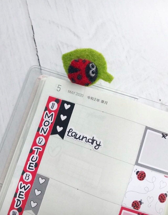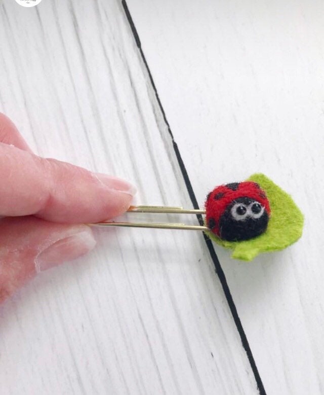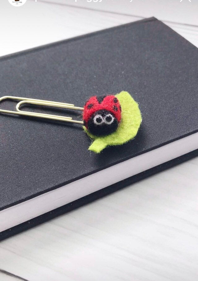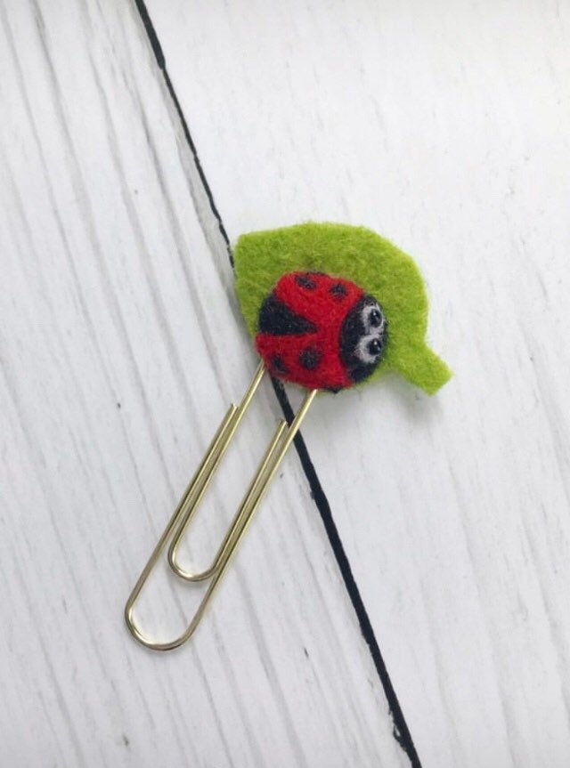 Layla the Ladybug is ready to keep your place in your planner, journal or book. Layla may also be used as a bookmark, page marker or to hold a money gift tucked inside a card. This cute little ladybug can easily personalize any gift in a jiffy. Layla is needle felted by me out of 100% wool. She is perched on top of a felt leaf and securely fastened to a jumbo sized paperclip in the finish of your choice: silver or gold tone. Leaf measures about 3cm wide and 2cm tall.