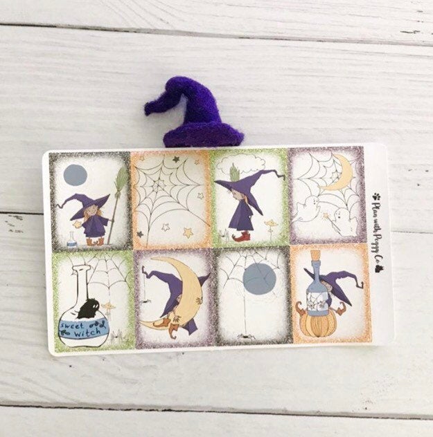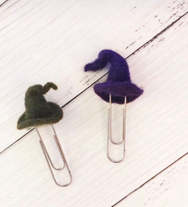 These adorable witch hats were made to coordinate with @planwithpeggy ‘s The Littlest Witch planner kit. Please check out her shop to see how cute the kit is. The little witch hat comes in two colors: bat purple and forest. Each clip is made out of Maori wool using the method of needle felting. The woolly figure is securely fastened to a 3 inch silver paperclip. The wool figure has a base that is 1.5 inches wide and is about 1.75 inches tall. Quantities are limited so don’t delay.