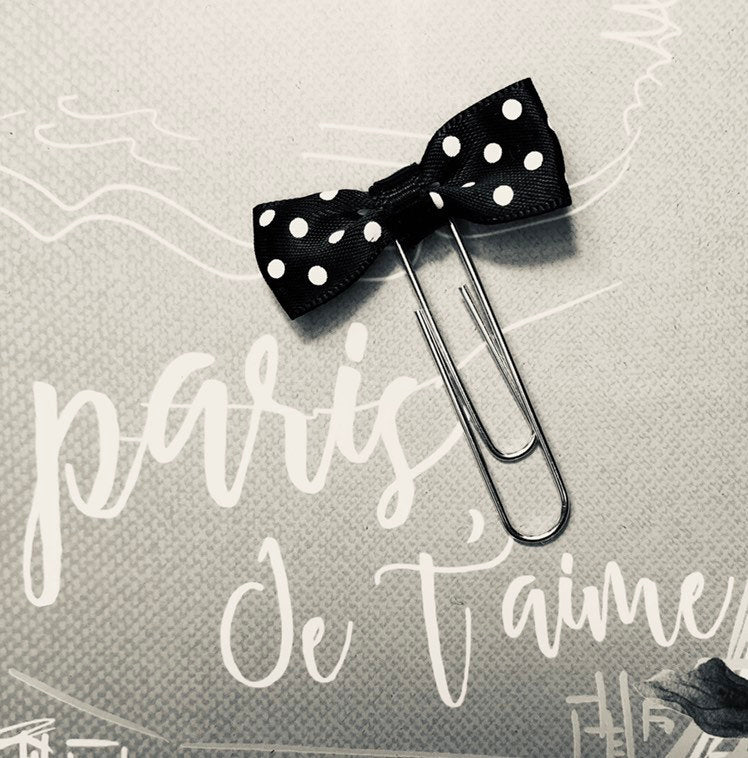 This simple black and white polka dot bow will complement any spread in your planner or journal. Bow measures 4cm wide and is securely fastened to a jumbo paper clip in the finish of your choice. Ooh la la