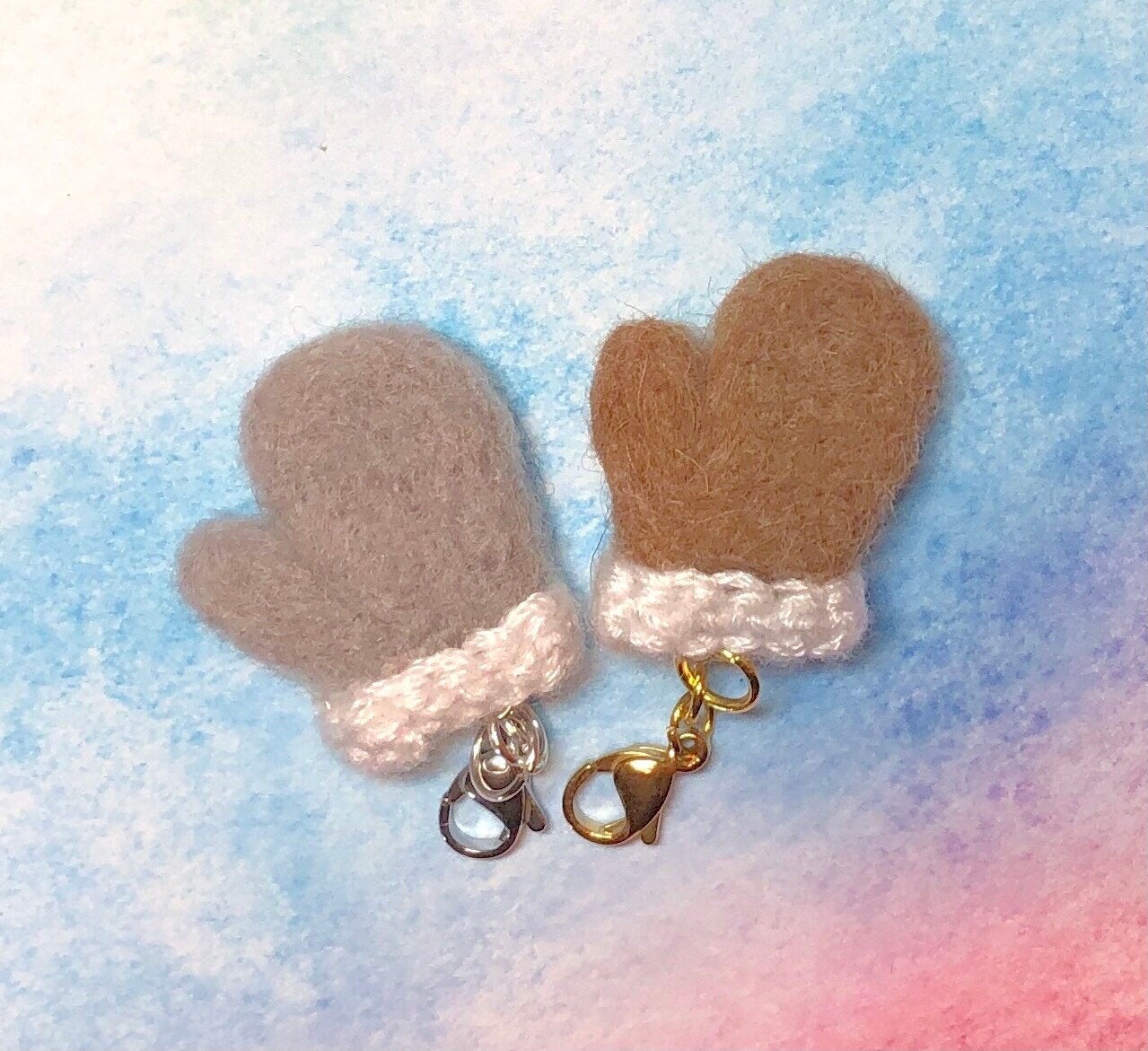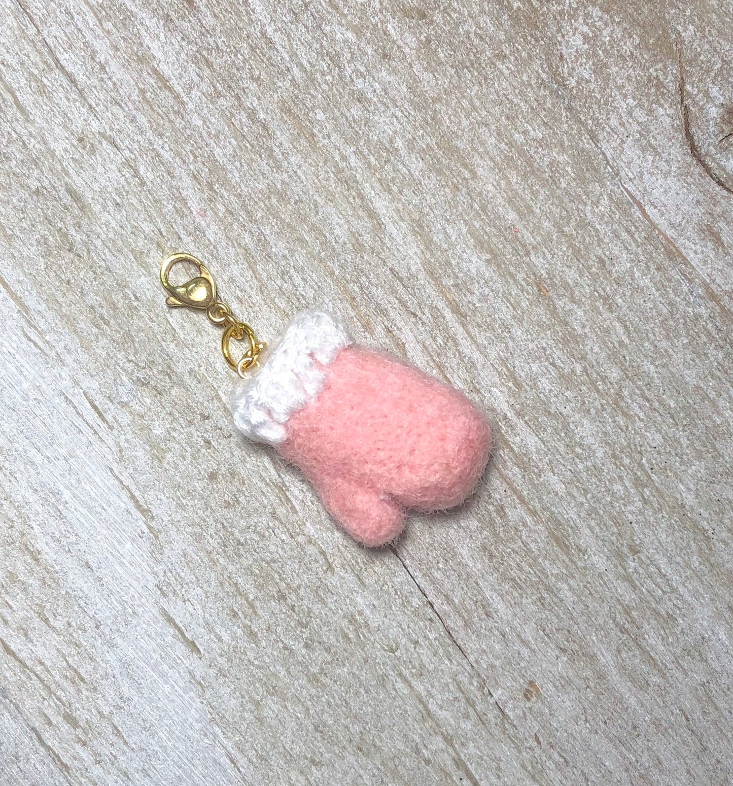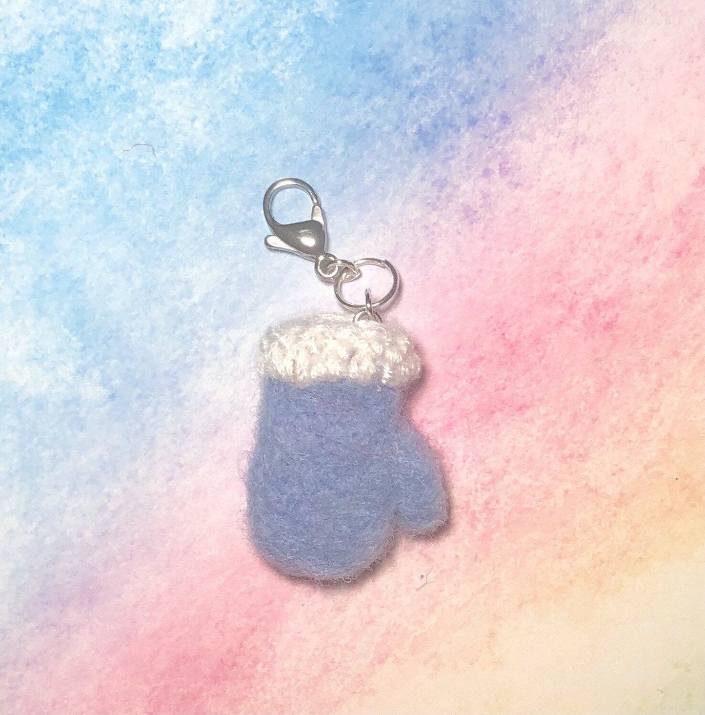 A single mitten hangs from a lobster clasp and is adorned with a crocheted trim around the wrist. Each mitten is made out of 100% wool and measures about 0.6 inches wide by 0.75 inches tall. Choose mitten color and hardware finish.
