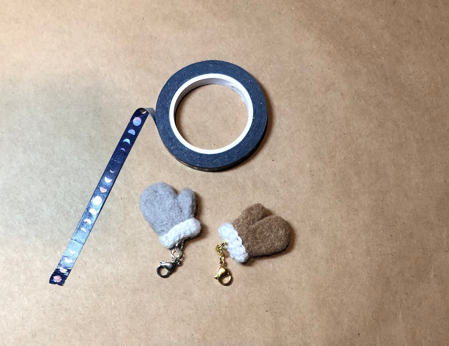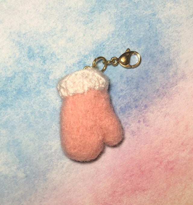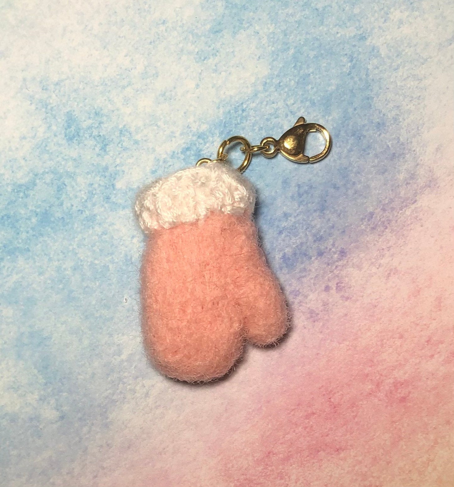 A single mitten hangs from a lobster clasp and is adorned with a crocheted trim around the wrist. Each mitten is made out of 100% wool and measures about 0.6 inches wide by 0.75 inches tall. Choose mitten color and hardware finish.